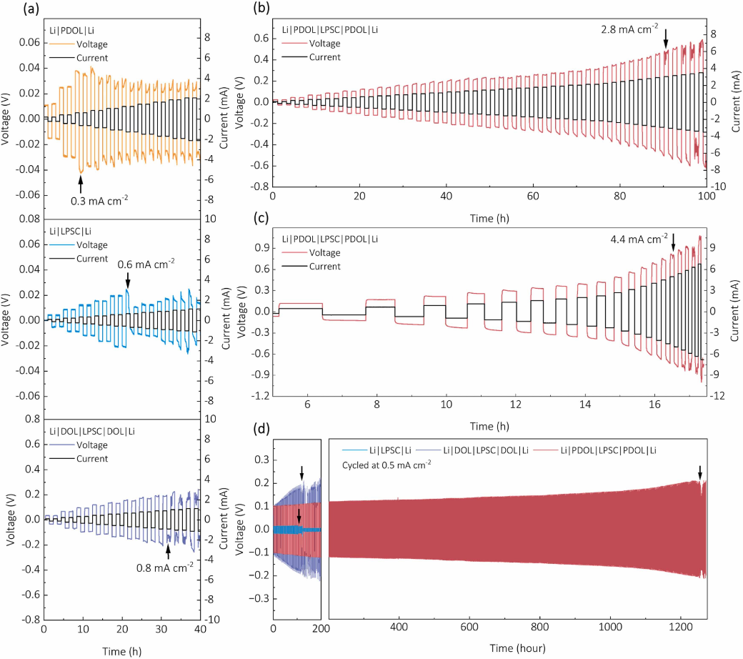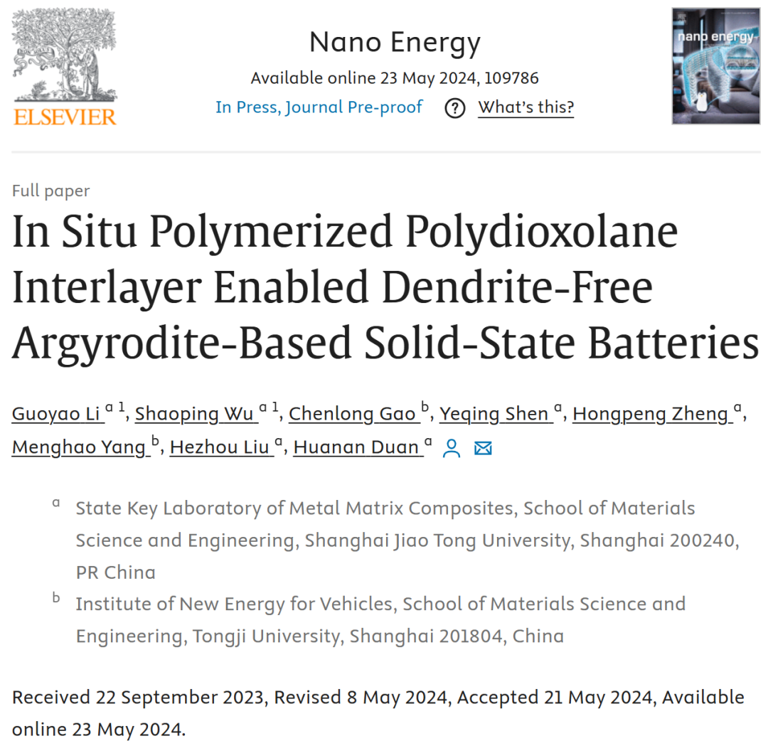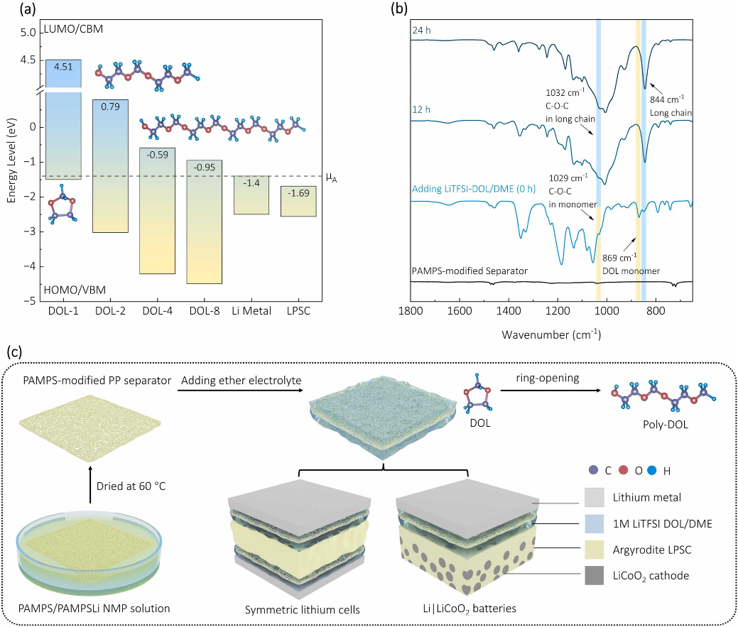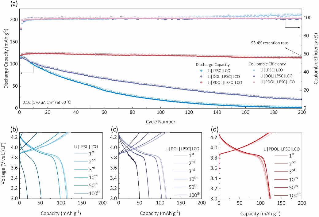 上海交通大学材料学院段华南教授在固态锂电池领域取得新突破近日,上海交通大学材料科学与工程学院/金属基复合材料国家重点实验室刘河洲团队段华南教授领导的小组在知名期刊《Nano Energy》(2022年影响因子17.60)上发表了题为“In Situ Polymerized Polydioxolane Interlayer Enabled Dendrite-Free Argyrodite-Based Solid-State Batteries”的学术论文。论文的第一作者是材料学院博士生李国耀和吴绍平(共同一作),通讯作者为段华南教授。 ![]() 固态锂电池有望解决传统锂离子电池中比能量与安全性之间的矛盾,被认为是下一代锂电池的主要发展方向之一,固体电解质为其中的关键材料。在诸多固体电解质材料体系中,硫银锗矿型硫化物固体电解质(LPSC)因其超高的离子电导率(>10 mS cm-1)和可冷压加工成固态电池器件而备受关注。然而LPSC/Li界面稳定性是急需解决的难题之一。本工作中,李国耀等人通过在LPSC和金属Li界面处引入原位聚合的醚类中间层,改善了LPSC/Li界面稳定性(图一)。室温下,在0.5mA cm-2电流密度下,锂锂对称电池实现了1250小时的长时间循环(图二)。由该聚合物中间层修饰的固态锂电池表现出了120.7 mAh g-1的初始放电容量,200圈循环后容量保持率高达95.4%(图三)。同时结合第一性原理计算(与同济大学杨孟昊老师合作)以及X射线光电子能谱(XPS)深度剖析等多种先进表征手段,对金属锂表面固体电解质层进行深入分析,对其增强机理做出了解释(图四)。此工作是该小组继Sn-O共取代以提高LPSC稳定性(Advanced Functional Materials 33 (2023) 2211805)的研究之后,LPSC/Li界面研究的一次突破,显著提高了此界面的稳定性和电流密度,在固态锂电池的应用上迈出重要的一步。 ![]() 图一 (a)醚类、金属锂和LPSC的LUMO/HOMO能级计算;(b)醚类电解液聚合前后的红外光谱;(c)原位聚合的醚类中间层应用于锂锂对称电池和固态电池的示意图。 ![]() 图二(a-c)对称电池在室温条件下的极限电流密度测试图;(d)Li|PDOL|LPSC|PDOL|LPSC对称电池在0.5 mA cm-2下的循环性能图。 ![]() 图三(a)固态锂电池在60℃条件下的充放电长循环测试;(d)固态锂电池在特定循环圈数(1,2,3,10,50和100)的充放电电压曲线。 ![]() 图四(a-d)Li/DOL界面的C 1s、O 1s、F 1s和S 2p的XPS深度剖析;(e-h)Li/PDOL界面的C 1s、O 1s、F 1s和S 2p的XPS深度剖析;(i-j)金属锂SEI层示意图。 |