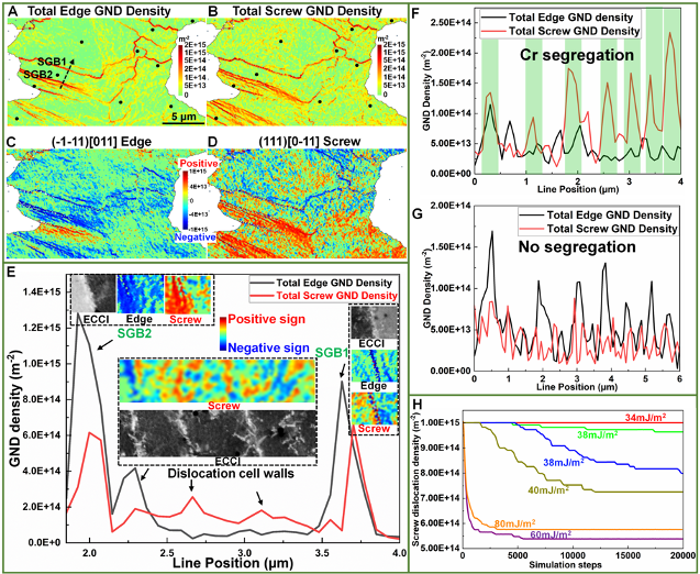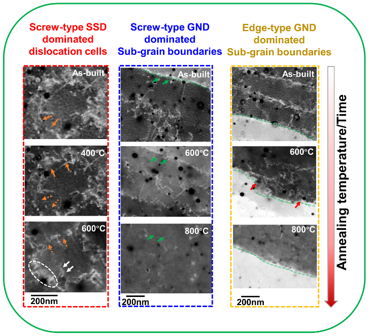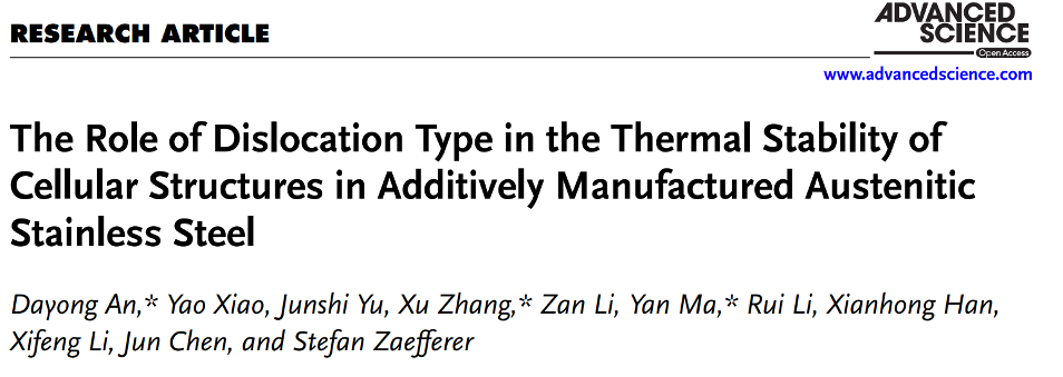 上交大安大勇副教授、陈军教授团队发表最新研究成果近日,上海交通大学材料学院塑性成形技术与装备研究院陈军教授课题组安大勇副教授,联合西南交通大学力学与航空航天学院张旭教授和德国马普钢铁所材料可持续合成课题组组长马焱博士(现荷兰代尔夫特大学助理教授)等,在增材制造奥氏体不锈钢胞状结构热稳定性机理研究中取得了重要进展,相关成果以“The Role of Dislocation Type in the Thermal Stability of Cellular Structures in Additively Manufactured Austenitic Stainless Steel”为题发表在Advanced Science上(https://doi.org/10.1002/advs.202402962)。 ![]() 激光粉末床熔融技术(LPBF)可以实现金属复杂零部件的高精度成形,已经发展成航空航天等领域的关键制造技术。LPBF制备的金属材料常具有亚微米尺度的凝固胞状结构,其含有高密度位错、纳米析出相和元素偏析等,对打印件的力学性能具有很大的影响。由于增材制造构件常服役于高温环境,打印组织的热稳定性决定了其服役可靠性。因此,揭示影响胞状结构热稳定性的关键因素及其内在机理对评估和提高增材制造零部件高温性能至关重要。 本文通过原位电子通衬度成像(ECCI)、高分辨电子背散射衍射(HR-EBSD)等先进表征技术结合三维离散位错动力学(3D-DDD)模拟手段,系统性揭示了凝固胞状结构中不同位错类型的形成机理及其对热稳定性的影响。如图1所示,研究发现:位错胞中绝大部分位错为统计储存位错(SSD),因此其取向差极小(<0.1°)。亚晶界(SGB)往往与凝固胞状结构边界重合,并且具有更高的几何必需位错(GND)。TEM-EDS结合HR-EBSD结果表明,在存在Cr元素偏析的位错胞中,螺位错类型占主导地位。而在Cr元素无明显偏析的位错胞中,探测到了刃位错为主的位错结构。上述结果表明:不同位错类型与Cr元素偏析相关,这是由于Cr元素偏析导致局部层错能的下降,大大提高了该区域螺位错的稳定性,最终形成螺位错占主导的位错结构。 ![]() 图1 胞状结构种不同位错类型的形成机理 研究团队进一步阐明了不同位错类型对胞状结构热稳定性的影响规律及其内在机理(图2):螺位错可以促进位错从位错胞/SGBs中脱钉,导致其具有较高的迁移/湮灭能力。相比之下,刃位错占主导的位错结构迁移需要位错之间相互协同运动,大大降低了其迁移速度,从而表现出更高的热稳定性。SGBs迁移过程中,不断捕获相邻的位错,因此,其取向差的增大或降低取决于相邻位错的符号。本研究强调了位错类型在凝固胞状结构热稳定性中的重要作用。此外,研究成果还为如何通过调节局部化学成分/层错能实现对位错类型的调控提供新的思路。 ![]() 研究团队感谢云耀深维(江苏)在LPBF样品制备上提供的技术支持。上述研究工作得到了国家自然科学基金(52101022, 12222209, 52101202)和国家重点研发计划(2022YFE0196600)的资助,也是团队近期在增材制造奥氏体不锈钢凝固胞状结构演变机理(Materials Research Letters 2024, 12(1):42-49)和高强韧机理(International Journal of Plasticity, 2023,170:103769)基础上的进一步拓展。 |