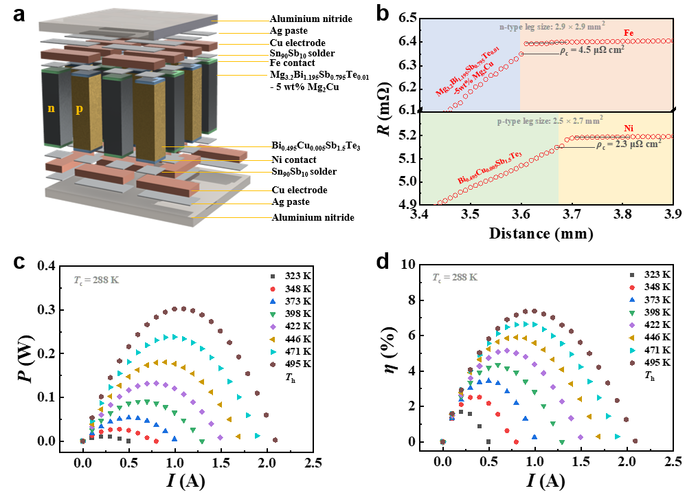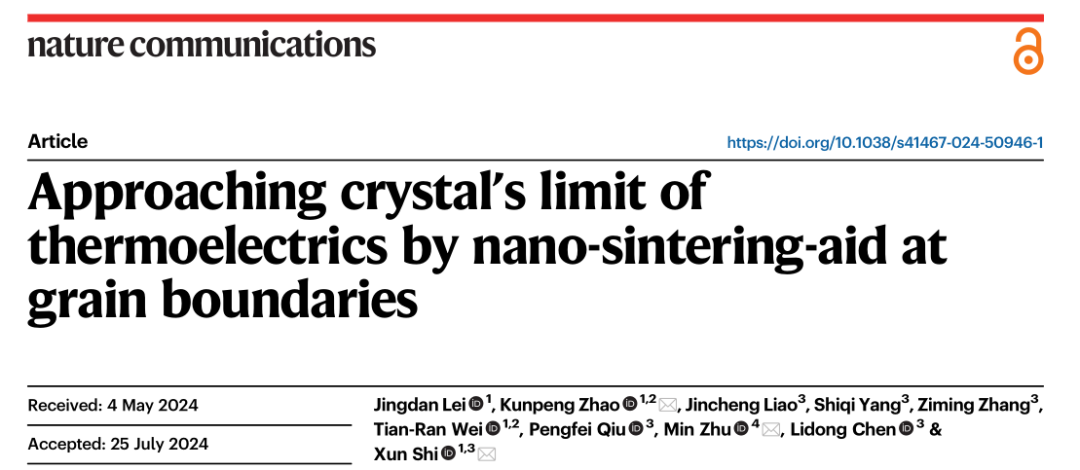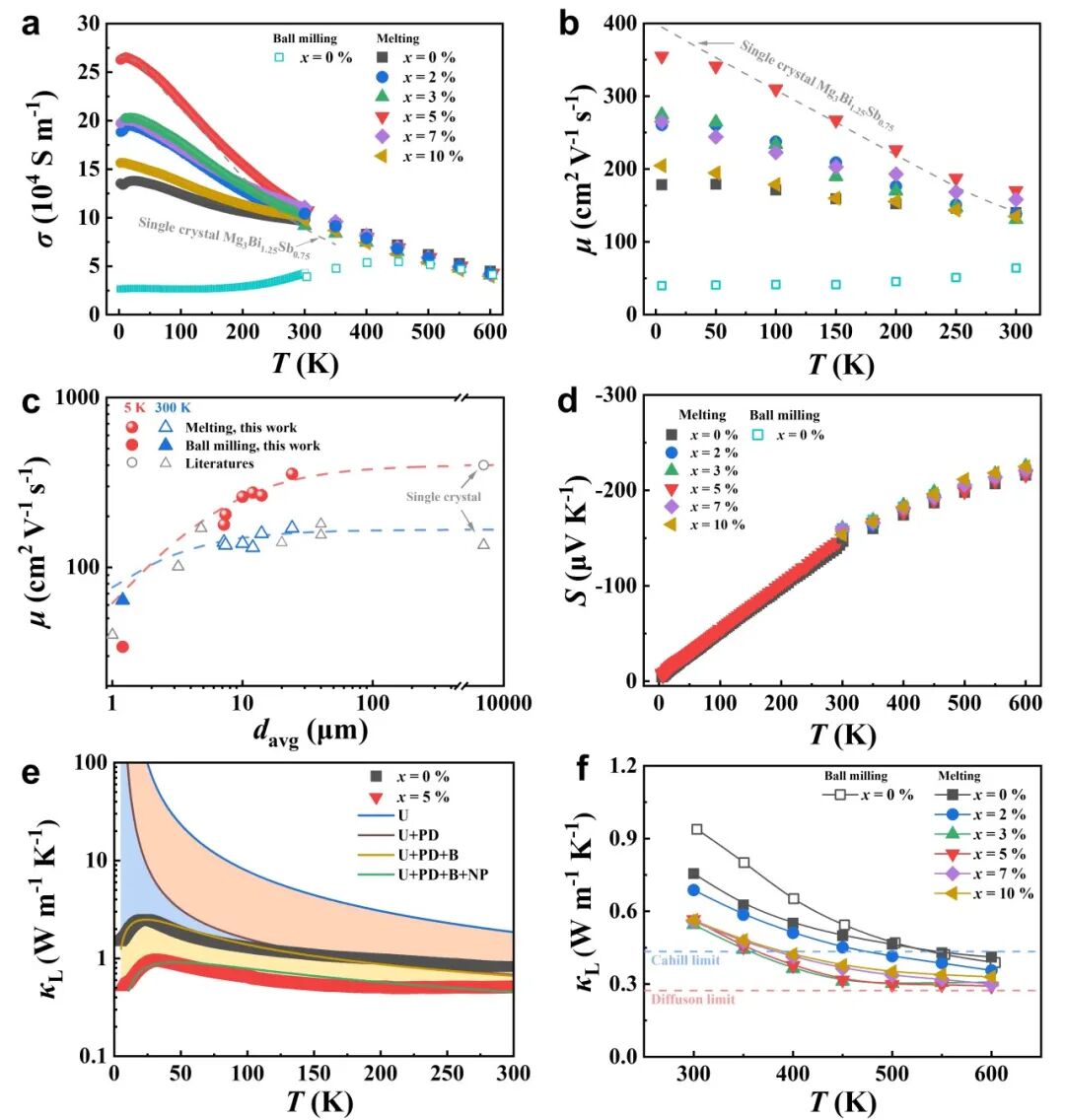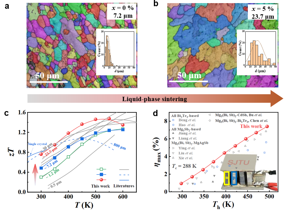 上海交大在Mg3Sb2基热电材料和器件研究方面取得新进展!近日,上海交通大学材料科学与工程学院与中国科学院上海硅酸盐研究所、乌镇实验室、中科院上海微系统所合作,在Mg3Sb2基材料的晶粒尺寸调控、热电性能优化和器件制备方面取得新进展,研究成果以“Approaching crystal’s limit of thermoelectrics by nano-sintering-aid at grain boundaries”为题,在线发表于国际著名学术期刊Nature Communications上(Nat. Commun. 15, 6588,2024)。研究发现,在Mg3Sb2基热电材料中添加纳米烧结助剂可有效增大晶粒尺寸并降低晶界势垒,从而获得与单晶相似的优异电输运性能。同时,纳米烧结助剂可强烈散射声子,导致极低的晶格热导率。优化后材料的热电性能优值zT在500 K时达到1.5,器件的能量转换效率在207 K温差下达到7.4%(图1)。2019级博士生雷景丹为该文章第一作者,赵琨鹏副教授、朱敏研究员和史迅教授/研究员为共同通讯作者。该研究得到了国家重点研发计划、国家自然科学基金和上海市基础研究特区计划等项目的资助和支持。 ![]() ![]() 图1. a, b Mg3.2Bi1.195Sb0.795Te0.01 – x wt% Mg2Cu (x = 0, 5)样品的EBSD图像。c 不同晶粒尺寸Mg3(Sb, Bi)2的热电优值zT。d Mg3(Sb, Bi)2基热电器件的热电转换效率。 工业生产中约有50%的余废热属于低品位废热(低于300°C),这不仅导致能源的浪费,还造成了环境污染。热电能量转换技术能够将废热直接转化为电能,具有寿命长、无噪音、稳定可靠、绿色环保等优点,被认为是利用低品位废热发电的最有前途的技术之一。优异的热电材料需要大泽贝克系数(S)维持高输出电压,高电导率(σ)减小焦耳热和低热导率(κ)来维持温差。多晶材料由于晶界的存在,载流子的晶界散射作用导致其电输运性能通常无法与单晶材料相媲美。然而,生长高性能、高质量、大尺寸的单晶是一项极具挑战性的任务,这一过程不仅耗时而且成本高昂,一定程度上限制了其在实际应用中的推广。通过调控晶粒尺寸和晶界势垒以减少晶界散射的影响,成为提升多晶材料热电性能的关键策略。 本工作开发了新型液相烧结工艺调控n型Mg3Sb2基热电材料的晶粒尺寸和优化热电性能。液相烧结技术被广泛用于制备陶瓷材料,通过在烧结过程中添加烧结助剂可有效降低烧结温度并控制晶粒的生长。本研究选取低熔点的Mg2Cu作为烧结助剂(熔点843 K),通过钽管封装熔融、低速球磨并结合放电等离子体烧结(烧结温度893 K)工艺制备了一系列Mg3.2Bi1.195Sb0.795Te0.01 – x wt% Mg2Cu材料。研究发现,当引入5 wt%的纳米Mg2Cu时,材料的平均晶粒尺寸davg可从7.2 μm增大至23.7 μm,从而显著改善了电输运性能。如图2a所示,不同晶粒尺寸材料的电导率σ具有明显不同的温度依赖性。x = 5 wt%样品表现出T−1.5温度依赖性,与单晶材料的电输运特性相似。霍尔数据表明,电导率的改善是由于缓和载流子晶界散射获得了优异的载流子迁移率μ。x = 5 wt%的样品在5 K时载流子迁移率为355 cm2 V−1 s−1,在300 K时载流子迁移率为170 cm2 V−1 s−1,接近单晶的载流子迁移率。研究人员进一步利用晶界散射模型揭示了μ和davg之间的关系(图2c)。当davg小于20 μm时,晶粒尺寸对载流子迁移率有显著影响;而当davg大于20 μm时,这种影响则显著减弱。Mg3.2Bi1.195Sb0.795Te0.01 – x wt% Mg2Cu的晶界势垒约为130 meV,低于很多已报道的Mg3Sb2基材料,说明晶界处Mg2Cu的修饰有效降低了晶界势垒。此外,所有样品都具有相近的载流子浓度和泽贝克系数,说明Mg2Cu只是起到了烧结助剂的作用,并没有作为掺杂剂进入晶格内部提供电子。这一结果也证实了样品中不同的电输运性质不是由载流子浓度和有效质量引起的,而是晶粒尺寸的差异所致(图2d)。 纳米烧结助剂的引入对热输运也有着重要影响。x = 5 wt%样品的室温晶格热导率仅为0.53 W m−1 K−1,低于基体的0.71 W m−1 K−1。为了深入理解Mg2Cu纳米相的在热输运中的作用,研究人员采用Debye-Callaway模型对低温热导率进行了拟合分析(图2e)。该模型综合考虑了多种声子散射机制:声子-声子Umklapp过程(U)、点缺陷散射(PD)、晶界散射(B)和纳米沉淀散射(NP)。通过将Mg2Cu纳米相的贡献纳入模型,实验数据得到了更为精确的拟合。这一结果表明,Mg2Cu纳米相在降低整体晶格热导率方面起到了关键作用,特别是在低温区域。 ![]() 图2. 随温度变化的a 电导率,b 迁移率,d 塞贝克系数,e-f 晶格热导率。c Mg3(Sb, Bi)2的迁移率随平均晶粒尺寸davg的变化关系。 为了验证Mg3.2Bi1.195Sb0.795Te0.01 – 0.5 wt% Mg2Cu在低品位废热回收方面的应用潜力,研究人员利用n型Mg3.2Bi1.195Sb0.795Te0.01 – 0.5 wt% Mg2Cu和p型Bi0.495Cu0.005Sb1.5Te3材料制备了具有8对热电臂的热电器件(图3a)。采用一步烧结法制备了由热电材料和接触层组成的热电臂。Fe和Ni分别用于n型和p型材料的接触层。如图3b所示,n型/Fe处的接触电阻率ρc仅为4.5 cm2,p型/Ni的接触电阻率ρc只有2.3 cm2,低接触电阻保证了界面内的较低电能损耗。当热端温度为495 K即ΔT为207 K时,最大输出功率P为~ 0.3 W,最大发电效率达到7.4%。液相烧结工艺的普适性意味着该方法同样适用于其他多种热电材料,如SiGe合金、PbTe、SnSe、Mg2Si和Half-Heusler,这些材料的性能均受到晶粒尺寸的显著影响。该研究工作为多晶热电材料的性能提升和应用开辟了新途径。 ![]() 图3. a热电器件示意图。b 热电臂的接触电阻。随电流变化的c 输出功率和d 转换效率。 |