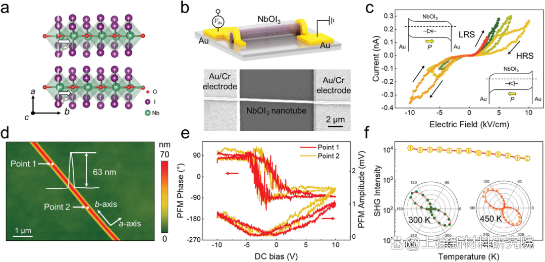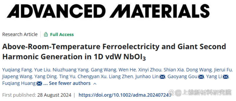 上交大材料学院黄富强团队在一维铁电材料上取得新进展近日,上海交通大学材料科学与工程学院黄富强团队与哈尔滨工业大学、西安交通大学、南方科技大学及中国科学院上海硅酸盐研究所合作,在铁电材料领域取得新进展,相关研究成果以“Above-Room-Temperature Ferroelectricity and Giant Second Harmonic Generation in 1D vdW NbOI3”为题在线发表在Advanced Materials上(https://onlinelibrary.wiley.com/doi/10.1002/adma.202407249)。该论文第一作者为上海交通大学材料学院副研究员方裕强、哈尔滨工业大学刘跃、中北大学杨牛壮、南方科技大学王刚。通讯作者为上海交通大学黄富强教授、哈尔滨工业大学李洋、西安交通大学缑高阳与南方科技大学林君浩。该研究得到了国家重点研发计划、国家自然科学基金、上海市科技启明星计划等项目的资助与支持。