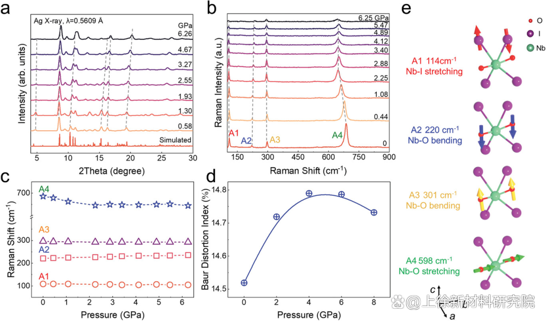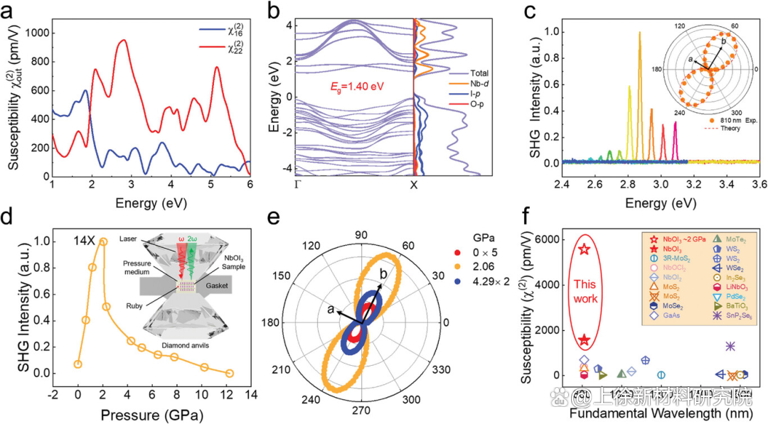 一维铁电性质的实现对于高密度铁电存储器件和非线性光学研究具有重要意义。与传统3D和2D铁电材料相比,1D铁电材料由于具有更高的表面能,在矫顽场、介电常数和自发极化能级等方面具有不同的性质。此外,尺寸的减小有利于形成单畴结构,进一步提高铁电性能,在非易失性存储器件、纳米发电机、非线性光子器件等方面具有巨大的应用潜力。因此,寻找可以剥离成一维铁电原子链的范德瓦尔斯准一维铁电化合物至关重要。 在此,团队发现一个具有高居里温度TC > 450 K和巨大二次谐波产生(SHG)的vdW一维铁电化合物NbOI3。微结构表征显示NbO3具有一维晶体链状结构,明显的电滞回线和铁电滞回线证实了材料中存在一维有序铁电行为。此外,NbOI3在810 nm的基波波长下表现出高达1572 pm V−1的SHG极化率,并且在2.06 GPa的压力下SHG极化率进一步增强至5582 pm V−1。理论研究表明咋压力作用下O原子沿Nb─O原子链移动,导致[NbO2I4]八面体的Baur畸变程度增加,从而引起二次谐波倍频增强。这一工作为开发新型铁电和光子器件提供了一维vdW铁电系统。 ![]() 图1. 一维 vdW NbOI3的结构表征 图2. 一维 vdW NbOI3的室温铁电性 图3. 常压和高压下NbOI3 的SHG 响应 图4. 高压下NbOI3的结构演化 |