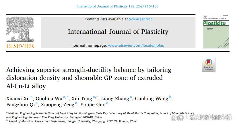 吴国华教授团队在变形铝锂合金强塑性协同调控方面取得重要进展近日,上海交通大学材料学院轻合金精密成型国家工程研究中心吴国华教授团队在变形铝锂(Al-Li)合金强塑性协同调控方面取得了重要研究进展,研究成果以“Achieving superior strength-ductility balance by tailoring dislocation density and shearable GP zone of extruded Al-Cu-Li alloy”为题,发表在国际塑性力学顶级学术期刊《International Journal of Plasticity》上。上海交通大学吴国华教授和童鑫助理研究员为该论文的共同通讯作者,博士生徐轩曦为第一作者,江苏大学汪存龙副教授为该论文的共同作者。该研究工作得到了国家自然科学基金的资助。