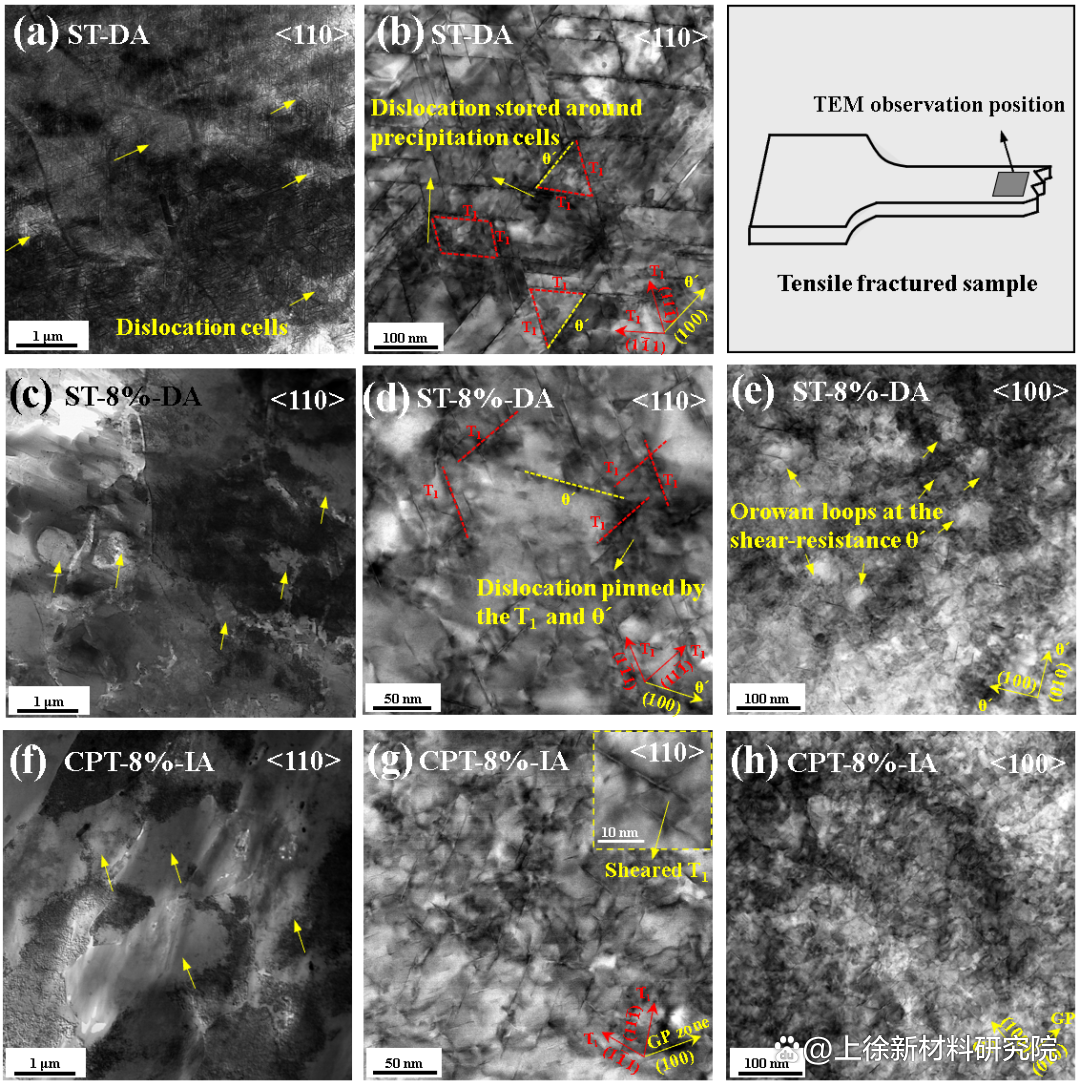 铝锂合金具有密度低、比强度和比刚度高、耐蚀性优良等特点,在航空航天、水下域等领域具有广阔的应用前景。研究表明,每向铝合金中添加1 wt%的Li,合金的密度降低3%,刚度提高6%。作为典型的第三代高强变形铝锂合金,2050、2195、2198等铝锂合金常应用于飞机的蒙皮、框架和桁条等关键承力结构。为了提高变形铝锂合金的强度,常采用形变热处理工艺(T8处理)来向合金基体中引入位错,以促进T1等强化相的析出,提高强化相在变形过程中对位错的钉扎作用。然而,T8态高强度变形铝锂合金的塑性往往较低,存在强塑性协同调控困难的问题,限制了高性能变形铝锂合金材料在航空航天等关键领域的推广应用。因此,亟需针对铝锂合金的形变热处理展开研究,并探明铝锂合金在塑性变形过程中各类析出相与位错的相互作用机制,从而协同调控变形铝锂合金的强塑性。 基于此,吴国华教授团队针对挤压变形Al-3.5Cu-1Li合金开发了一种全新的形变热处理工艺,创新性地在预变形之前引入预时效处理来促进亚稳态GP区的形成,从而缓解了预变形过程中因位错缠结造成的局部应力集中,获得了均匀的位错分布;进一步地,再通过低温间断时效获得GP区(数纳米)和T1相(数十纳米)共存的多尺度异构组织。研究发现,与传统T8处理的合金相比,这种特殊的多尺度异构组织能有效促进位错交滑移来提高合金的应变硬化能力,改善合金塑性变形时位错分布的均匀性。结果表明,上述制备工艺使合金在保持较高屈服强度的基础上,将合金延伸率提高了一倍以上,所制备的合金综合力学性能优异(屈服强度657 MPa,抗拉强度700 MPa,延伸率13.5%),突破了变形铝锂合金强塑性难以协调的关键瓶颈。基于铝锂合金在塑性变形中的组织演变特点,构建了铝锂合金塑性变形过程中析出相与位错的相互作用模型,探明了变形铝锂合金的强韧化机制,为高性能变形铝锂合金材料开发与强韧化协同调控提供了理论依据。 近年来,在丁文江院士的大力支持下,吴国华教授团队在高性能铝锂合金材料开发与成形技术方面取得了一系列原创性科研成果,旨在推动我国高性能铝锂合金的发展与应用。 ![]() 图1 新型形变热处理对位错分布的影响 图2 间断时效处理后的析出相形貌与结构 图3 变形失效样品中位错与析出相的相互作用过程 图4 新型形变热处理中形成的组织结构对应变分布的影响 图5 本研究与已发表论文中实验结果的比较 |