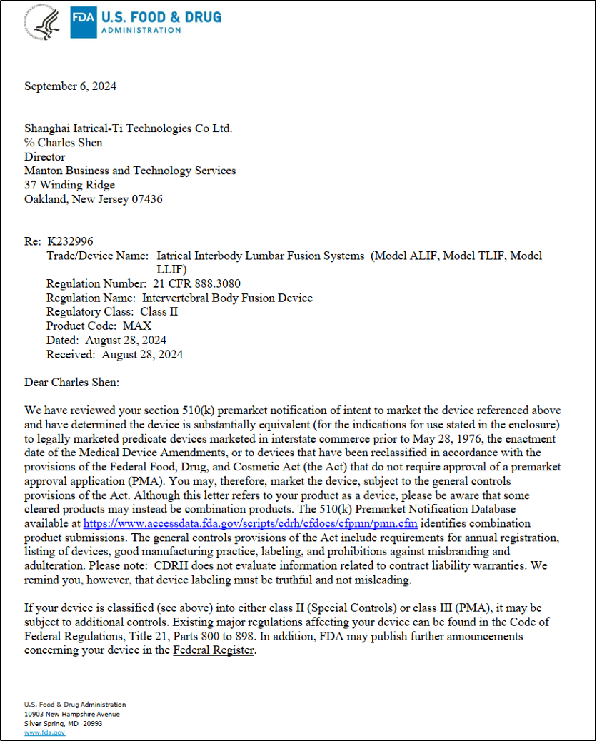 全球首款基于超材料的3D打印骨骼植入体近日,由上海交通大学材料学院顾剑锋教授团队、钟豪章博士领衔研发的全球首款基于超材料的3D打印椎体融合器成功通过美国食品药品监督管理局(FDA) 510(K)认证,编号为K232996(图1),标志着这一创新科技在医疗器械领域迈出了重要的一步。作为全球首例基于超材料设计的人造骨骼植入体,该突破性技术不仅展现了超材料在医疗领域的应用潜力,更为骨科植入物的发展树立了新的里程碑。
